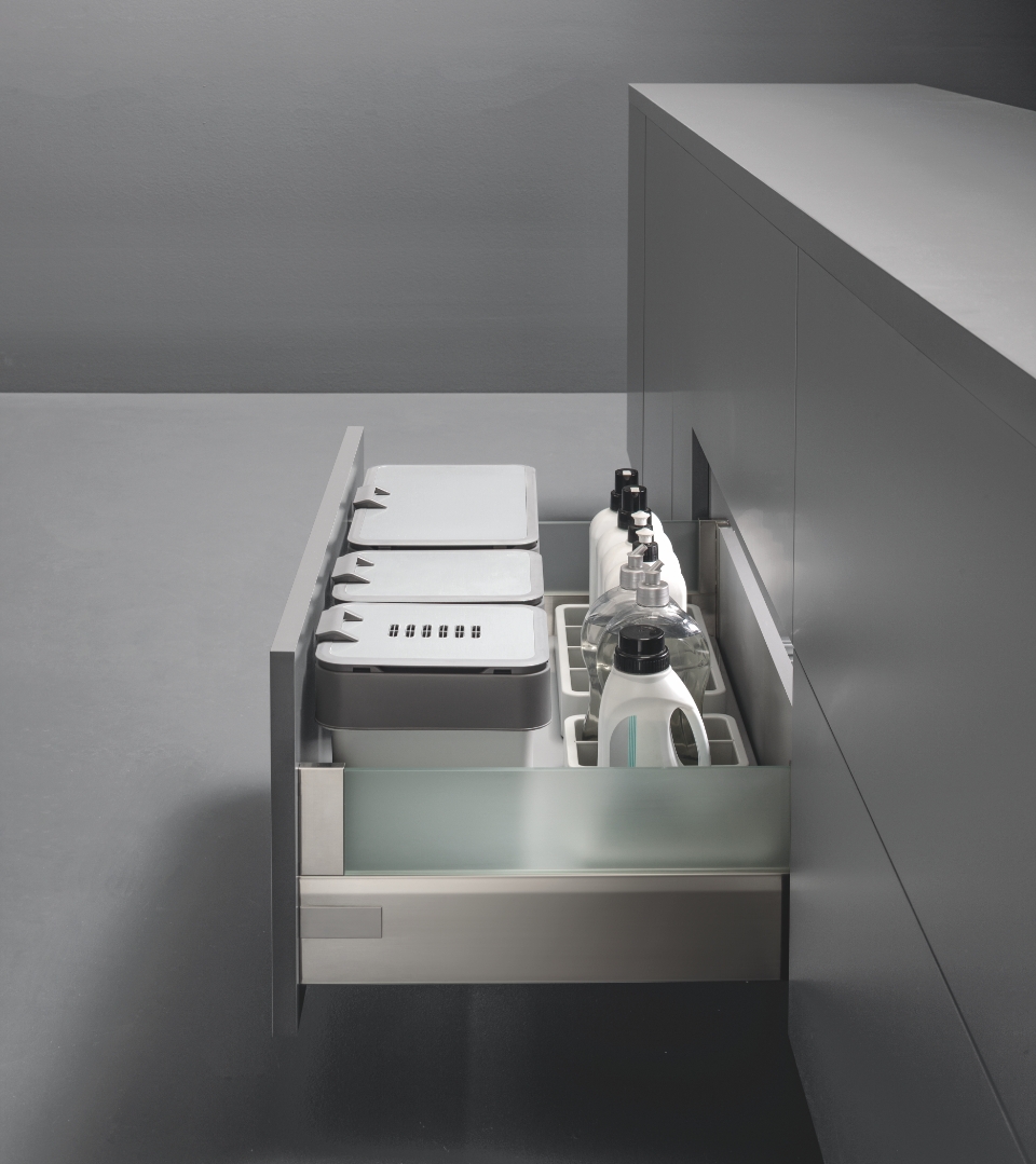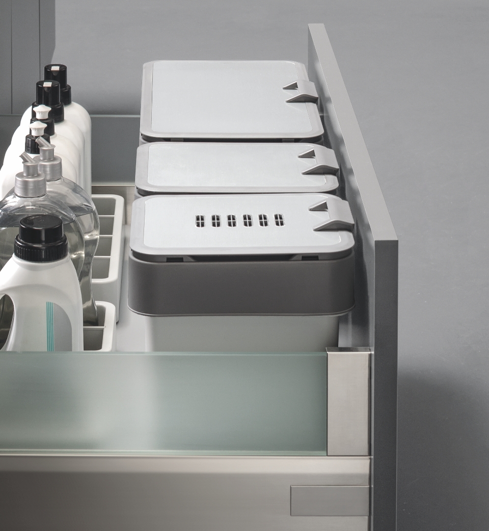 Kit sottolavello inferiore abbinato a coperchi Glamour, ovvero coperchi incernierati con manici amovibili completo di filtro anti-odore per l'umido, e disponibile in un'ampia varietà di altezze a seconda dello spazio disponibile e del volume desiderato. Composto da un basamento in lamiera progettato per essere appoggiato direttamente sul fondo del cassetto, presenta dei fori prespaziati per poter alloggiare le pattumiere in polipropilene e le vaschette con divisori per organizzare diversi prodotti per la pulizia.