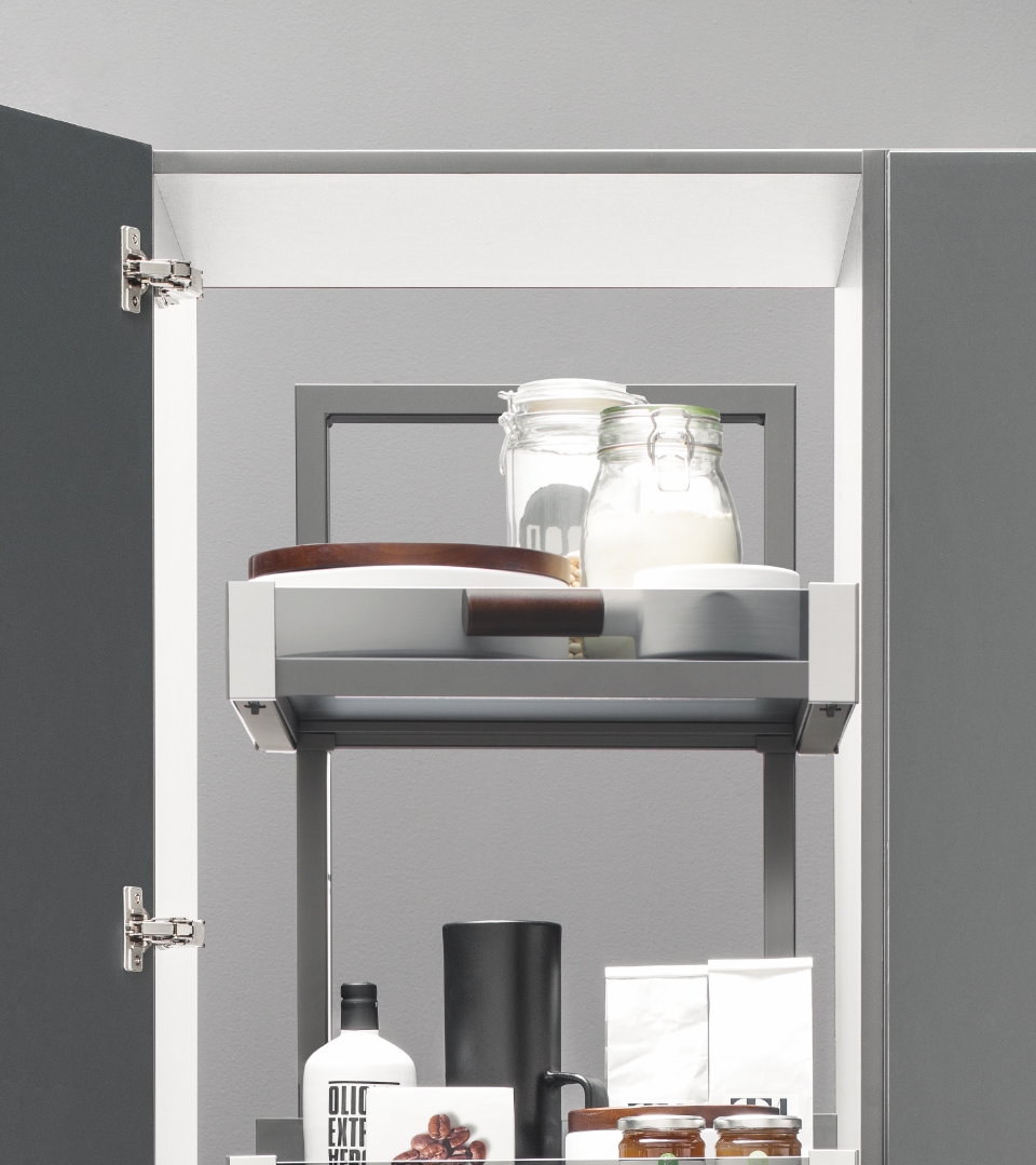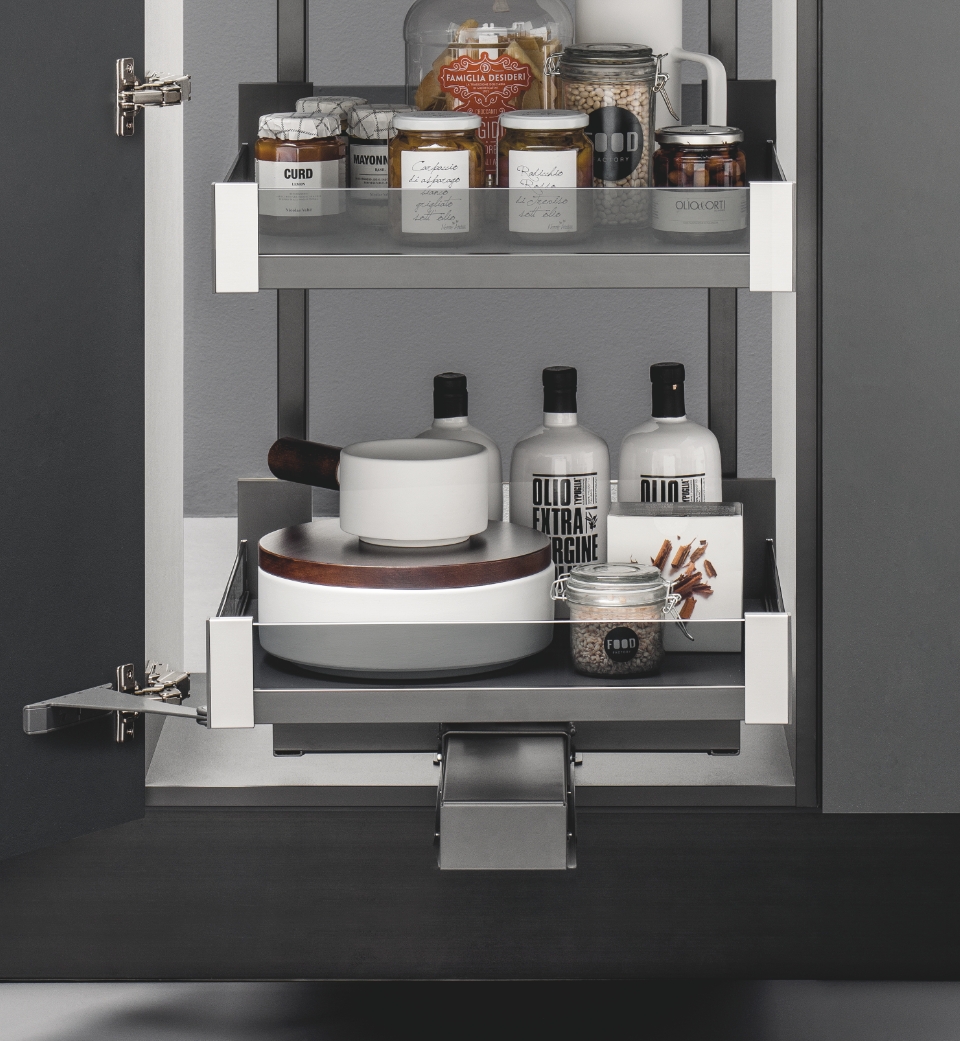 La maxi colonna è sinonimo di maxi spazio. All'apertura, anche a pieno carico, i cesti con profilo di contenimento in vetro fumé o Noce Savoia e fondo in HDF, ampi e capienti, fuoriescono verso l'esterno simultaneamente consentendo un diretto e facile accesso all'intero contenuto anche nelle zone posteriori e fino al ripiano più alto.