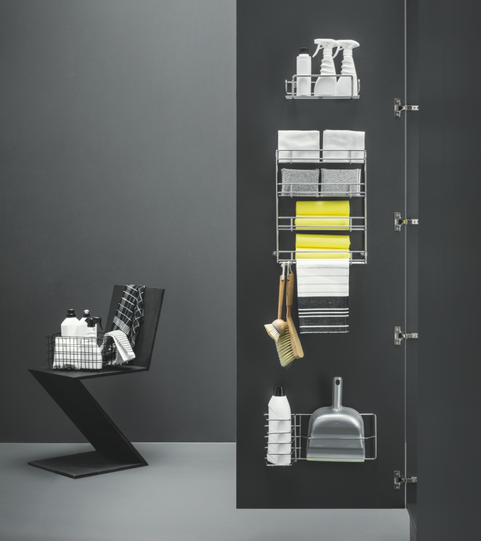 Portaccessori in filo da agganciare direttamente sull'anta del mobile per stoccare diversi prodotti per la pulizia e risparmiare spazio all'interno del mobile.