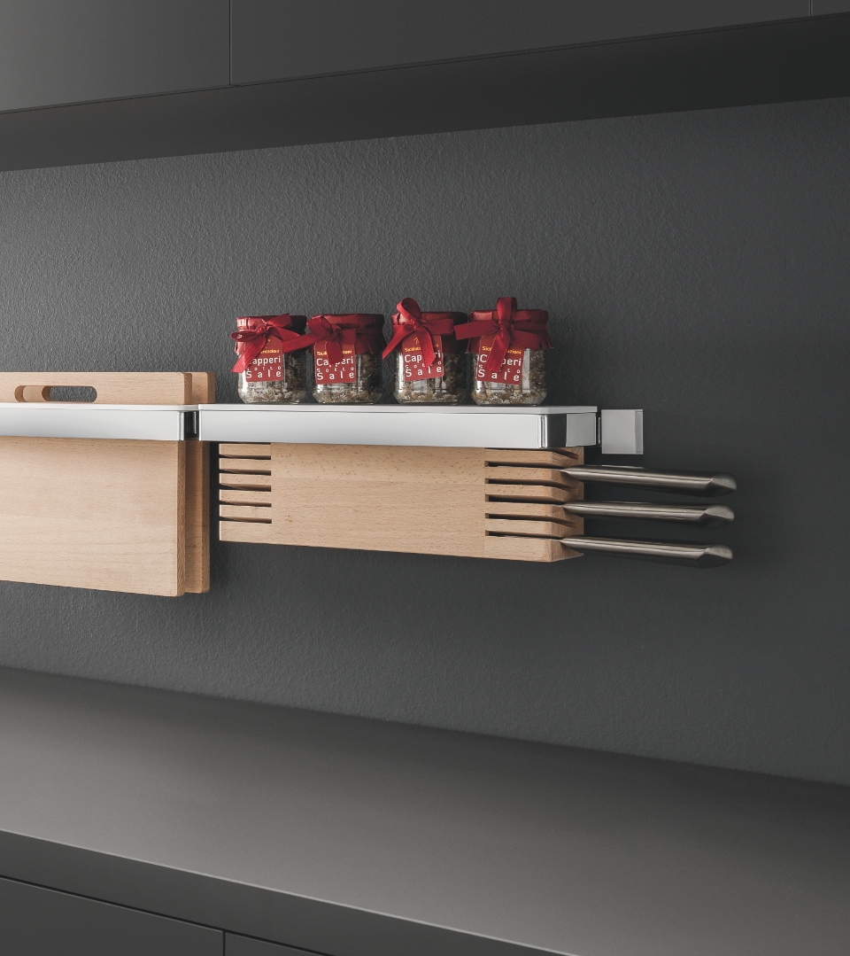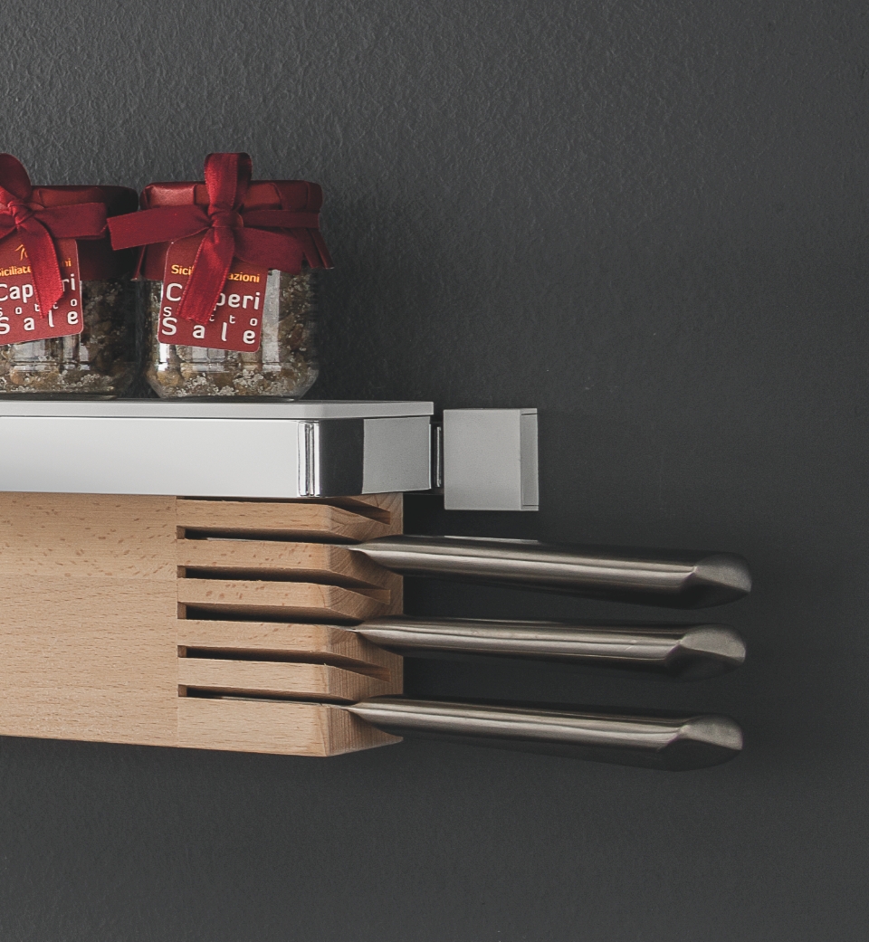 Accessorio portacoltelli in legno di faggio con l'aggiunta di una mensola nella parte superiore per riporre altri oggetti, da agganciare sulla barra di supporto della linea Mirage.
