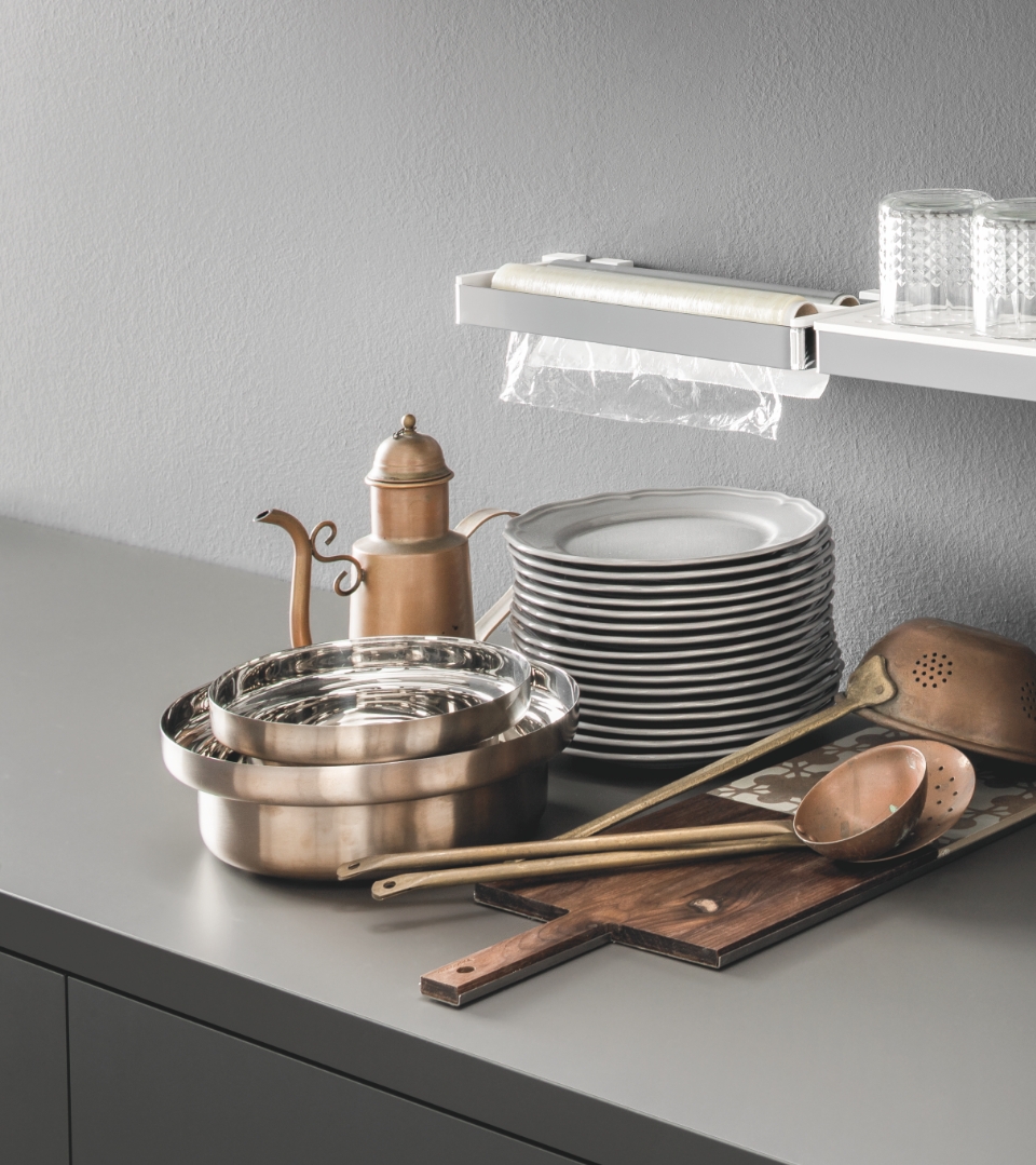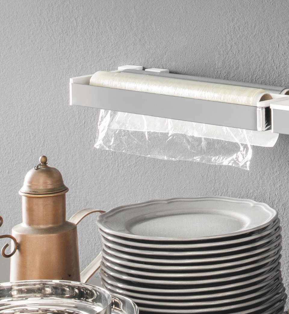 Accessorio per stoccare i diversi rotoli utilizzati in cucina con l'aggiunta di un bordo seghettato per facilitare lo strappo, da agganciare sulla barra di supporto della linea Mirage.