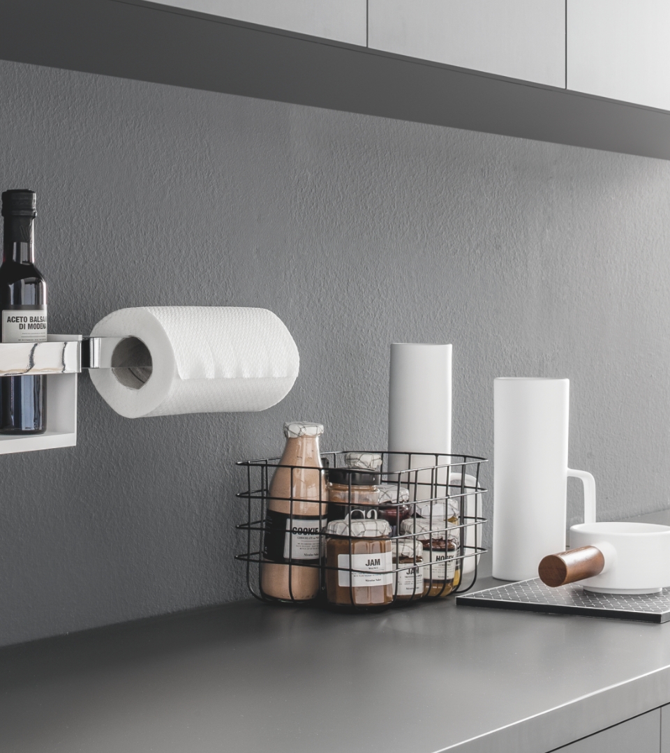 Accessorio per stoccare il rotolo di carta assorbente da agganciare alla barra di supporto della linea Mirage.