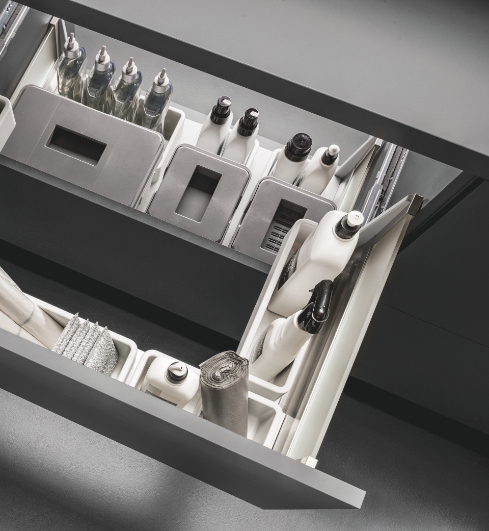 Sottolavello superiore realizzato con struttura autoportante in lamiera elettrozincata. Le vaschette laterali e frontali con divisori possono essere posizionate a seconda delle esigenze, assicurando dunque versatilità e una buona ottimizzazione dello spazio.