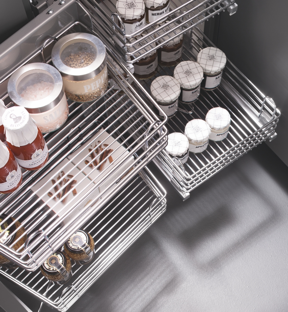 Lo Smart Corner estraibile rende "intelligente" qualsiasi mobile angolare. Composto da una coppia di cesti principali che esce solidale con l'anta e una coppia di cesti interni scorrevoli ed estraibili totalmente, migliora la fruibilità ottimizzando, al contempo, l'angolo e riducendo al minimo le perdite di spazio.