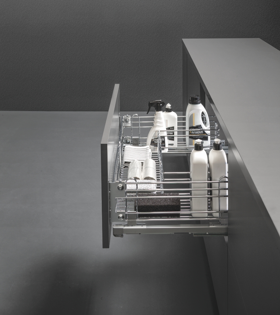 Sottolavello superiore con struttura in filo tondo cromato composto da un cesto sagomato che può essere estratto totalmente per garantire accessibilità e massima fruibilità.